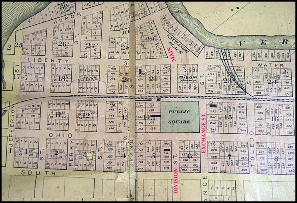 As is obvious, Division (now Main) Street originally did not appear to “officially” go through the Town Square. The map was drawn in 1876. Please note that I am “speculating” that it might have been that a passageway (i.e. a street) through west side of the square was not a part of the original plan. Perhaps it came about because of foot and wagon traffic generated by churchgoers and others as the village grew.